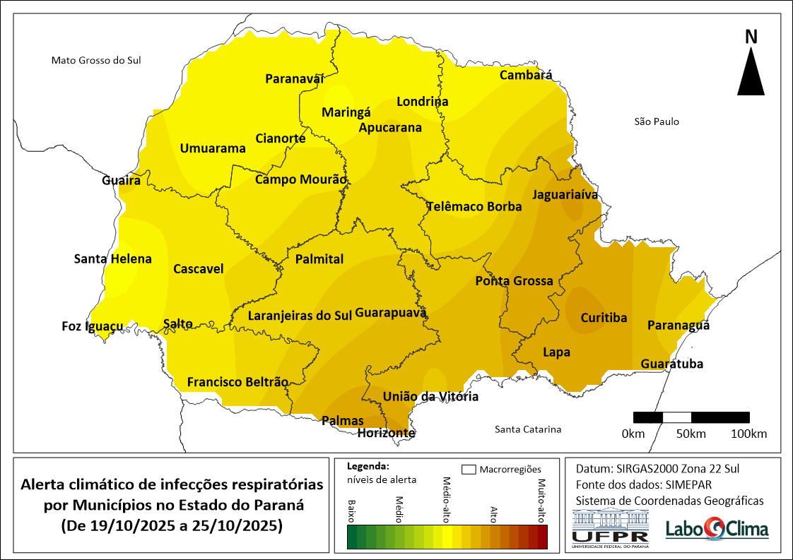 Desenvolvido em caráter especial pelo Laboratório de Climatologia (LABOCLIMA) da Universidade Federal do Paraná (UFPR), este serviço objetiva contribuir com as ações emergenciais de enfrentamento à pandemia do novo coronavÃrus (SARS-CoV-2) através de um sistema que alerta para a formação de condições climáticas favoráveis à sua transmissão no Estado do Paraná. Este boletim terá periodicidade semanal de publicação, em consonância com a semana epidemiológica brasileira. Os dados meteorológicos utilizados no modelo foram cedidos pelo SIMEPAR (Instituto Tecnológico do Paraná).