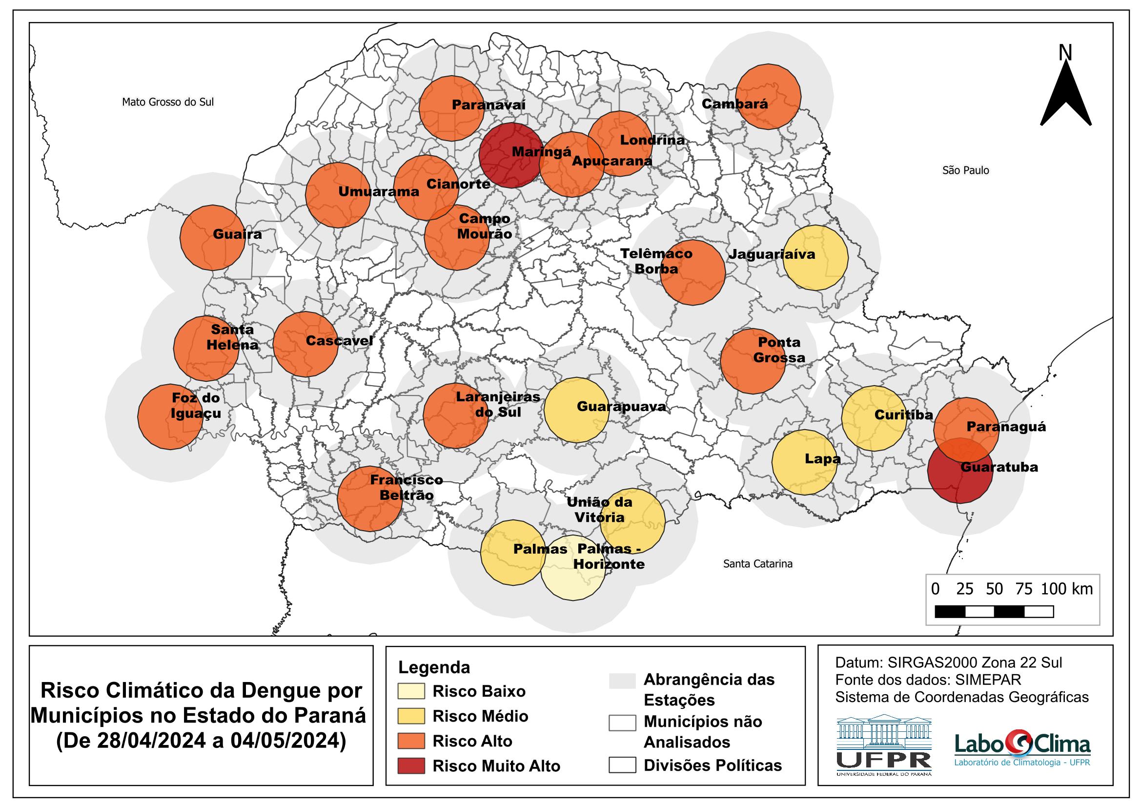 ATUALIZAÇÃO (Janeiro 2026): devido ao avanço das pesquisas sobre a influência do clima na proliferação de vetores como Aedes aegypti, mostrou-se necessária uma atualização na representação dos nÃveis de alerta de nosso sistema. Desse modo, duas mudanças importantes foram efetuadas – a primeira foi a mudança do gradiente de cores, utilizando um gradiente de alerta mais contundente com tonalidades do amarelo ao vermelho. A segunda mudança foi a supressão do nÃvel de alerta “sem risco”, pois o atendimento atual, principalmente devido ao aumento da temperatura em todo Paraná, é de que não existem mais situações totalmente sem risco, mas sim de risco baixo. Também foi criado o nÃvel “muito alto”, quando as condições foram ótimas para a reprodução do vetor. Assim, substituição tanto das cores quanto dos nÃveis de alerta pretende trazer mais atenção à s condições favoráveis de transmissão de doenças como Dengue, Zika e Chikungunya.