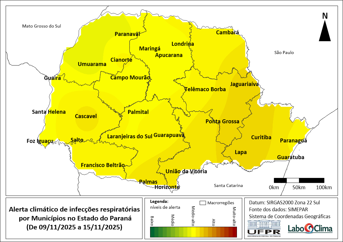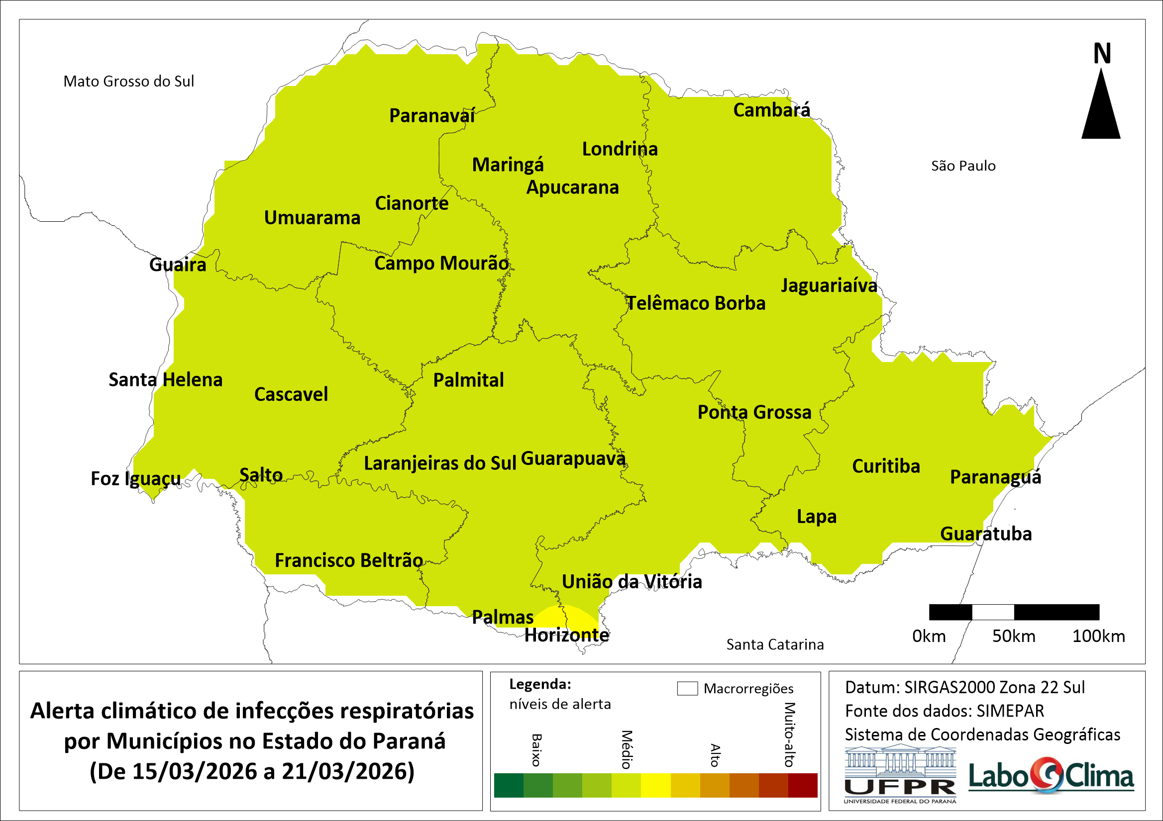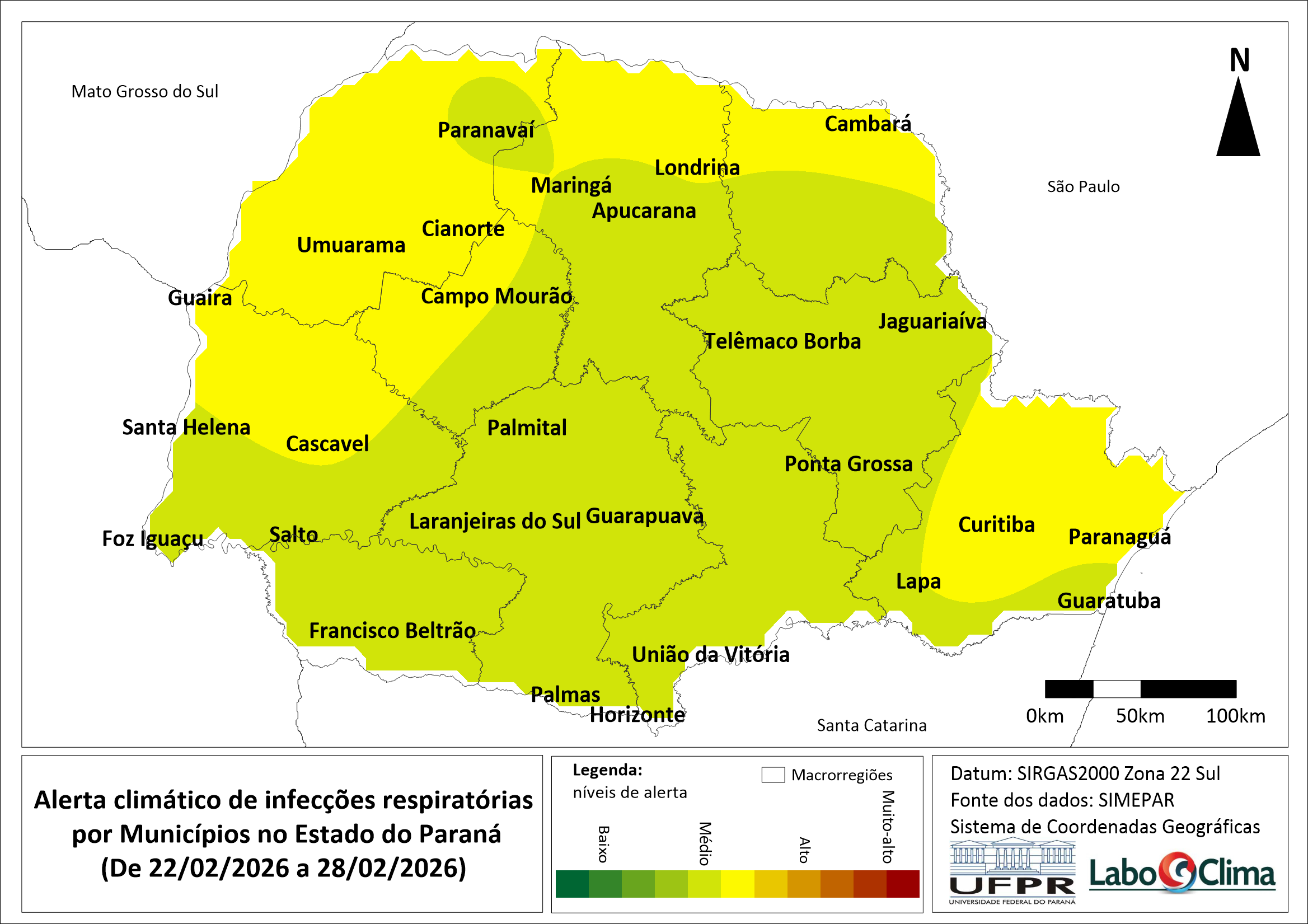 Desenvolvido em caráter especial pelo Laboratório de Climatologia (LABOCLIMA) da Universidade Federal do Paraná (UFPR), este serviço objetiva contribuir com as ações emergenciais de enfrentamento à pandemia do novo coronavÃrus (SARS-CoV-2) através de um sistema que alerta para a formação de condições climáticas favoráveis à sua transmissão no Estado do Paraná. Este boletim terá periodicidade semanal de publicação, em consonância com a semana epidemiológica brasileira. Os dados meteorológicos utilizados no modelo foram cedidos pelo SIMEPAR (Instituto Tecnológico do Paraná).