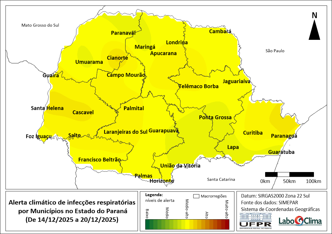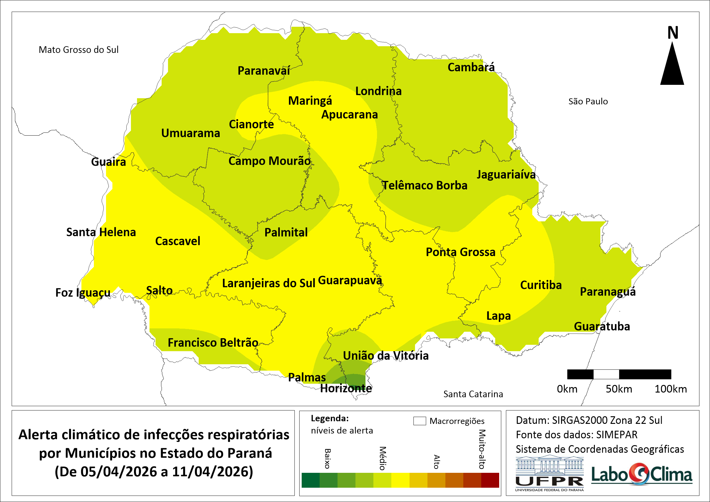 Desenvolvido em caráter especial pelo Laboratório de Climatologia (LABOCLIMA) da Universidade Federal do Paraná (UFPR), este serviço objetiva contribuir com as ações emergenciais de enfrentamento à pandemia do novo coronavÃrus (SARS-CoV-2) através de um sistema que alerta para a formação de condições climáticas favoráveis à sua transmissão no Estado do Paraná. Este boletim terá periodicidade semanal de publicação, em consonância com a semana epidemiológica brasileira. Os dados meteorológicos utilizados no modelo foram cedidos pelo SIMEPAR (Instituto Tecnológico do Paraná).